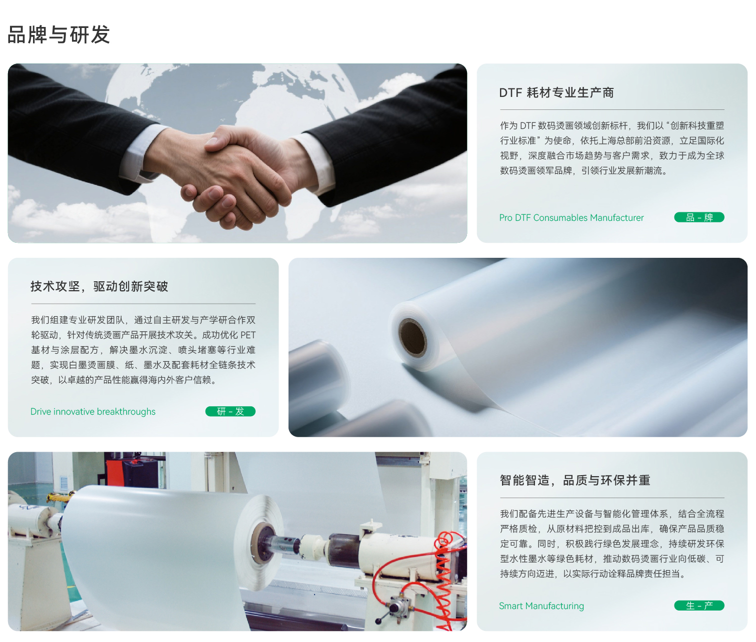 - 作为行业领先的高新技术企业,公司始终以 “技术突破 + 品质升级” 双轮驱动,推动 DTF 技术在全球市场的规模化应用与可持续发展。